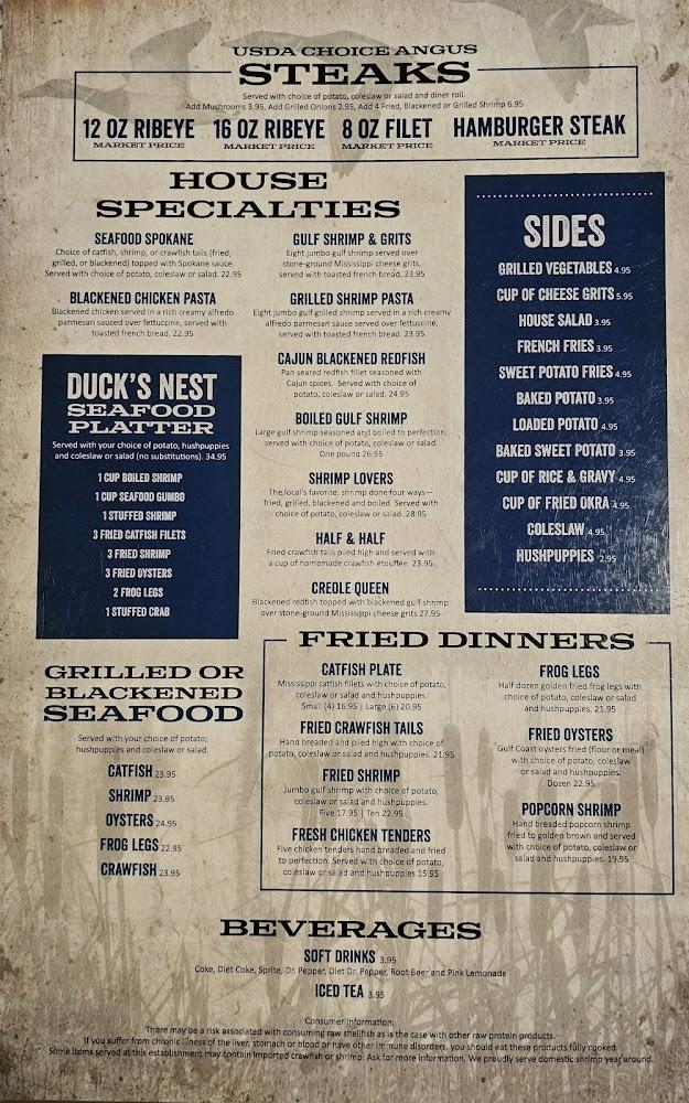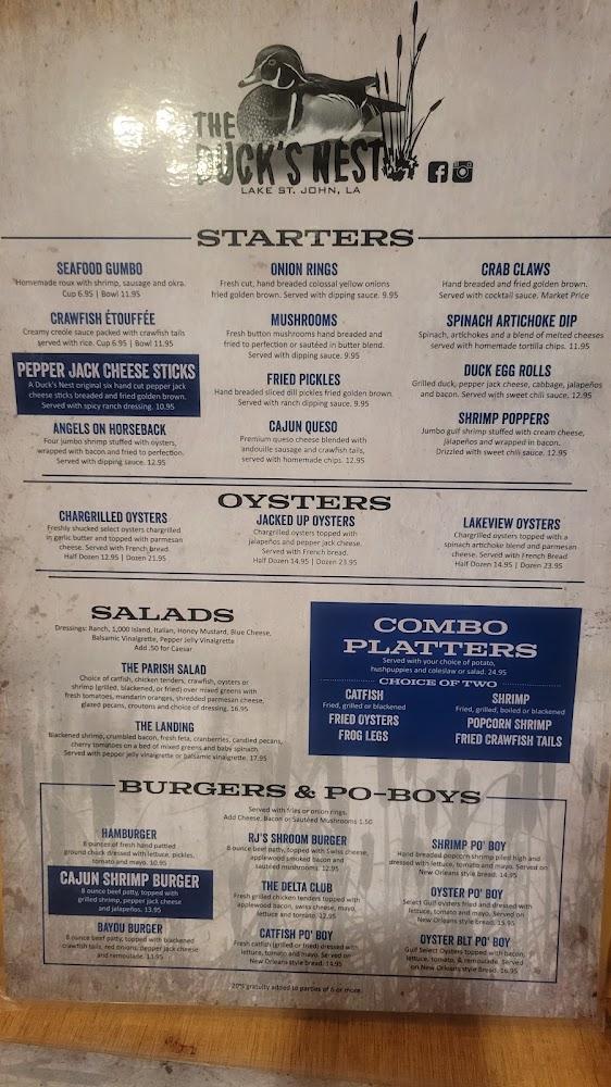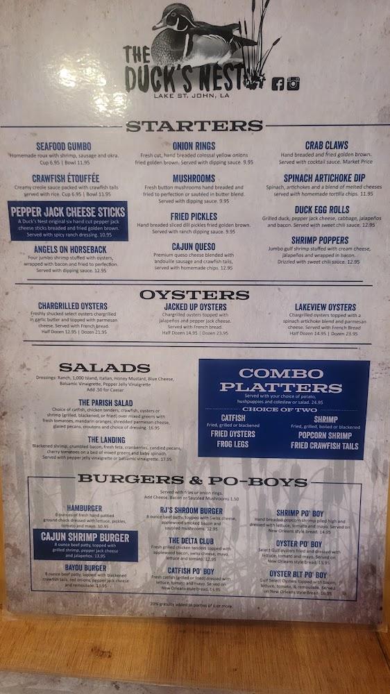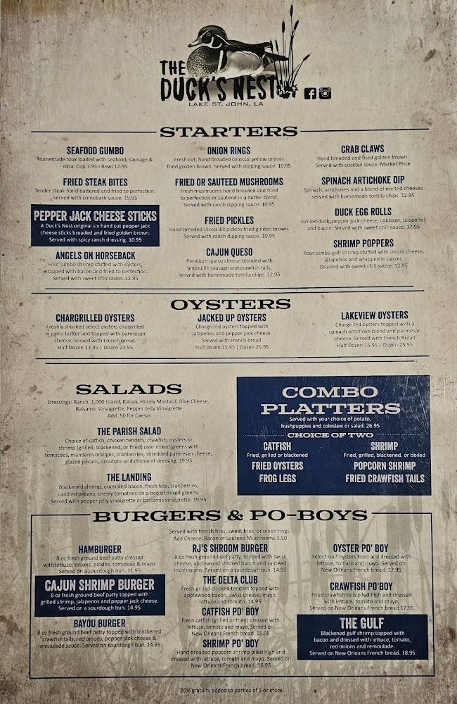 The menu at Duck's Nest II features a delightful mix of classic Louisiana dishes and contemporary favorites. Starting with starters, guests can choose seafood gumbo or fried steak bites, setting a robust tone for the meal. Salads like The Parish Salad offer fresh options, balancing heavier plates.